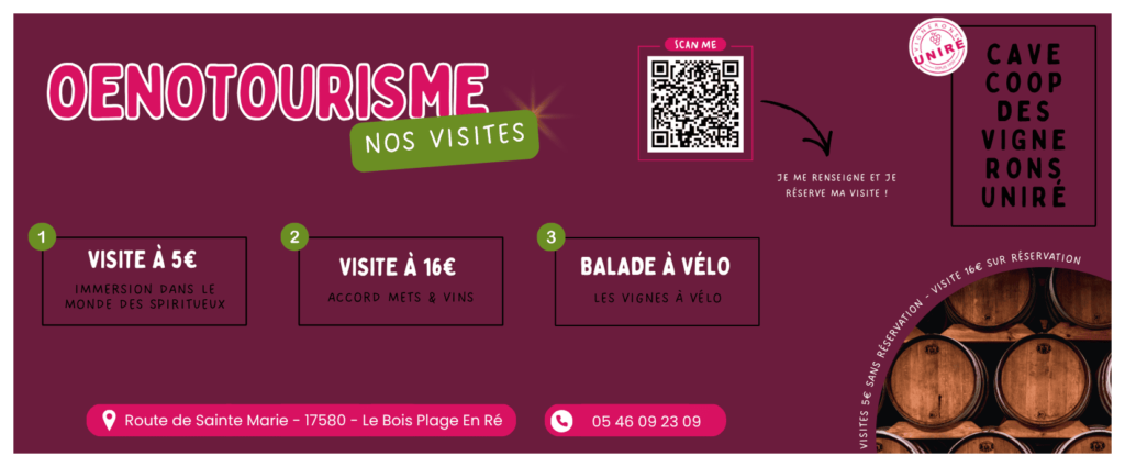 La Coopérative vous accueille tout au long de l’année pour vous faire découvrir son univers. Nous proposons trois formules selon vos envies : une visite « Immersion dans le monde des spiritueux » à 5€ par personne pour découvrir les secrets de fabrication de nos eaux-de-vie de Cognac et de nos Pineau des Charentes, une visite « Accord mets et vins » à 16€ par personne pour une expérience plus approfondie, et une balade à vélo dans les vignes pour parcourir le vignoble rétais au grand air. Des formules adaptées aux groupes sont également disponibles sur réservation.